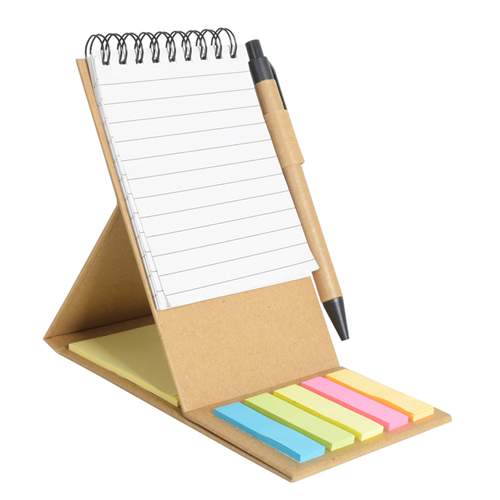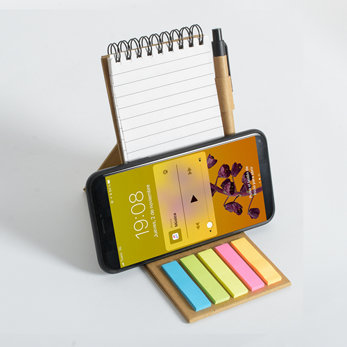 Libreta con pasta de cartón, banderines, notas adheribles y bolígrafo con tinta de escritura negra, hojas rayadas, y pasta que se puede doblar para mayor comodidad, asimismo sirve como soporte para el celular.