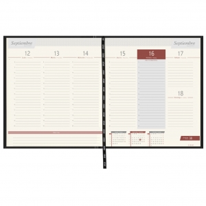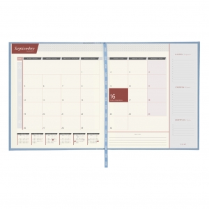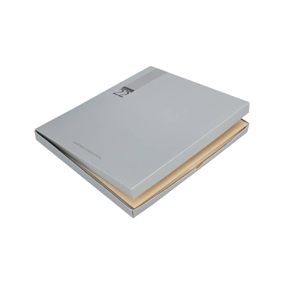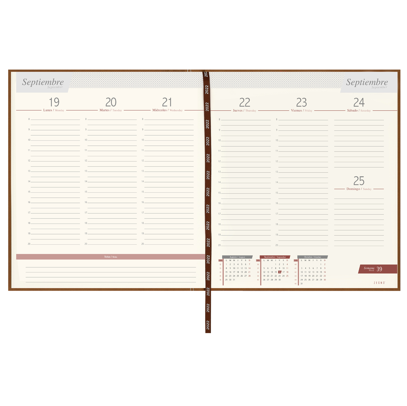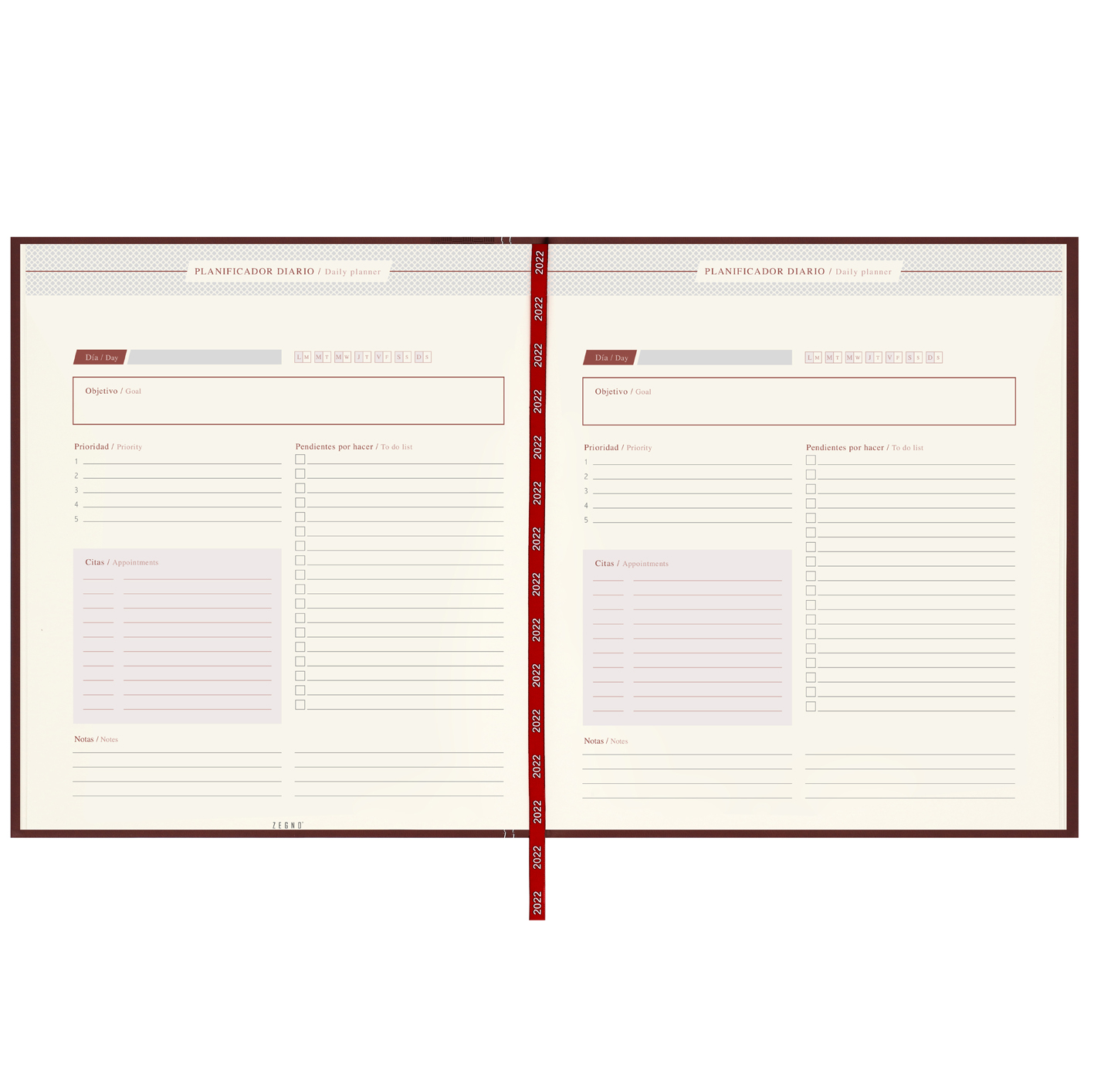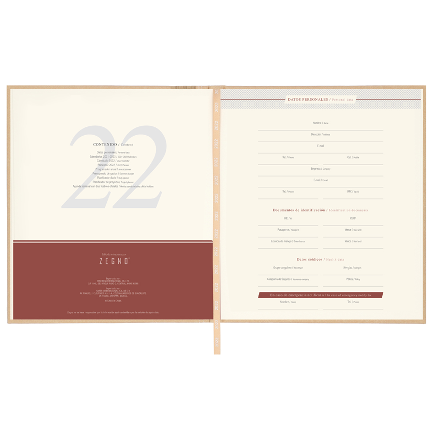 Agenda con 80 hojas. Contiene calendarios 2021-2023, calendario 2022, planeador 2022, programador anual, presupuesto de gastos, planificador diario, planificador de proyecto y agenda semanal con días festivos oficiales. Incluye caja individual.