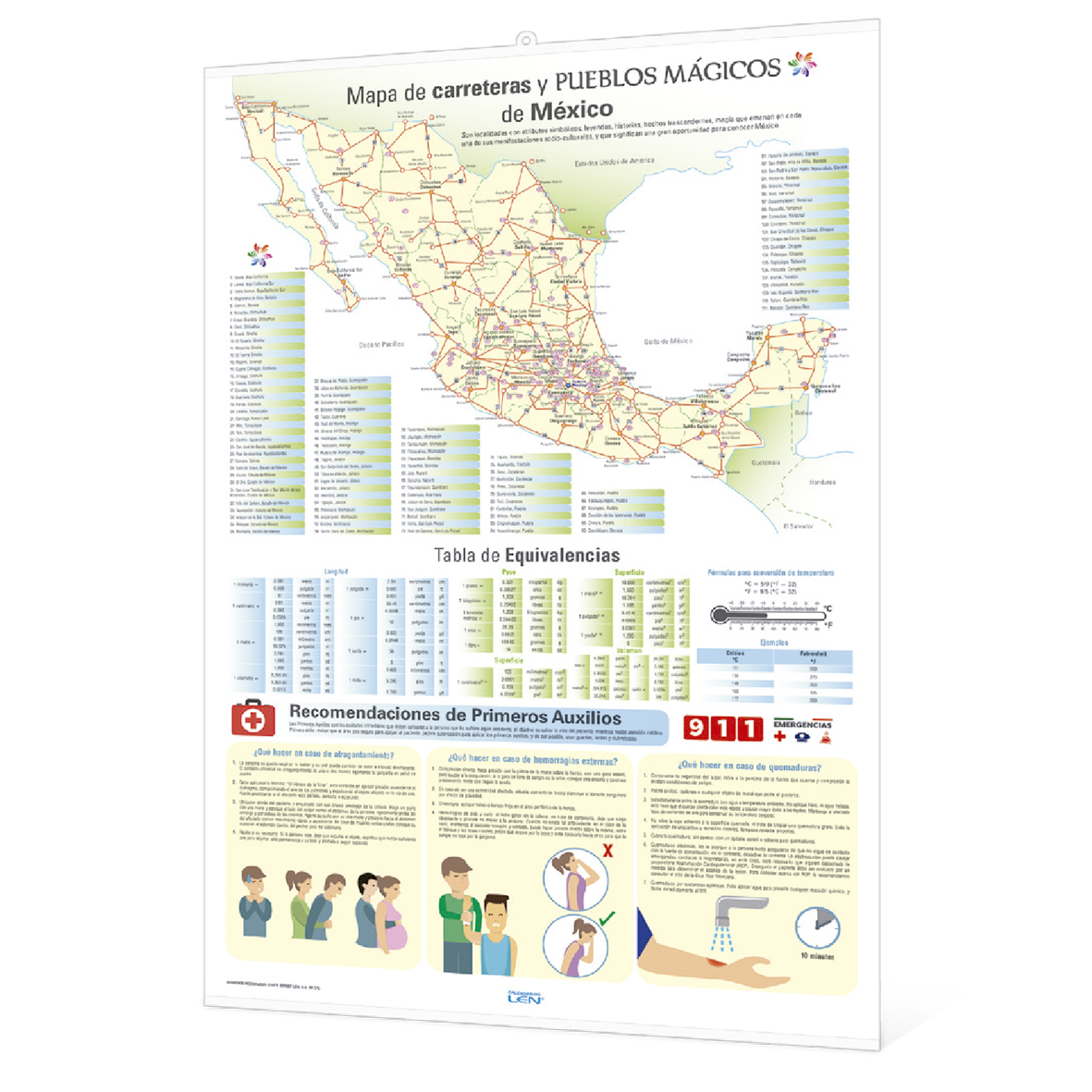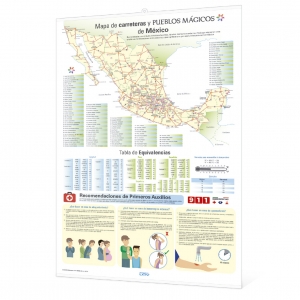 | CONTENIDO: | Calendario bilingue, Num. de la semana, Santoral, Fases lunares, Eclipses, Estaciones, días feriados de México, EUA y Judios. VUELTA: mapa de carreteras y ubicación de los pueblos mágicos, Tabla de equivalencias, recomendaciones de primeros auxilios. |