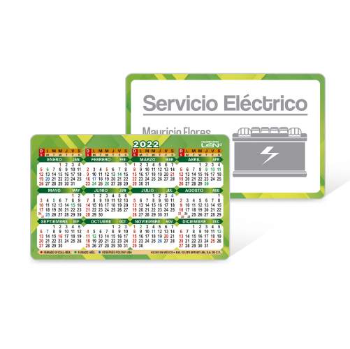 | CONTENIDO: | Frente: Area para publicidad, Reverso: Calendario Bilingue y diás feriados en México y EUA |