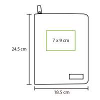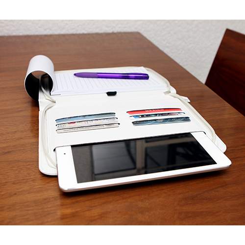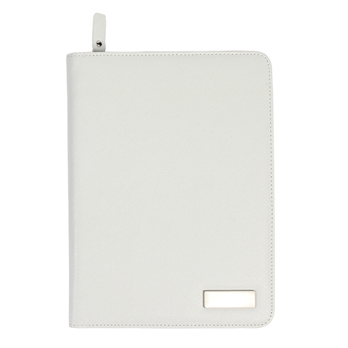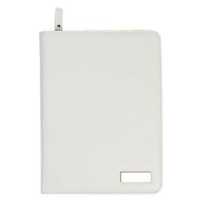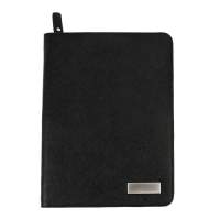 Carpeta con cierre, block a5 con 50 hojas, porta tarjetas y placa metalica, colores: blanco y negro