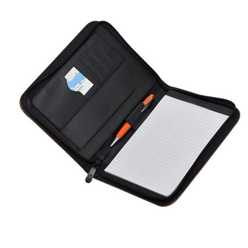 Carpeta portafolio sydney fabricada en curpiel con compartimentos interiores, cierre y block con 30 hojas