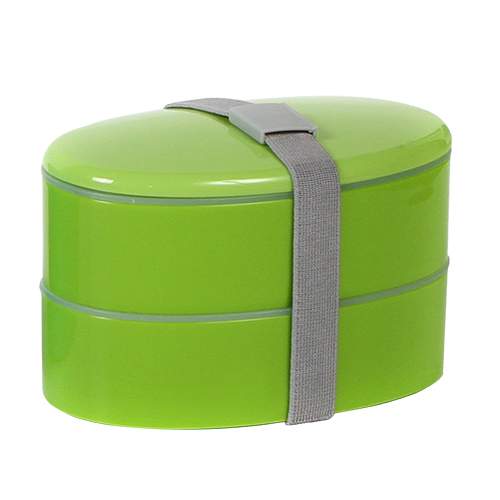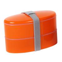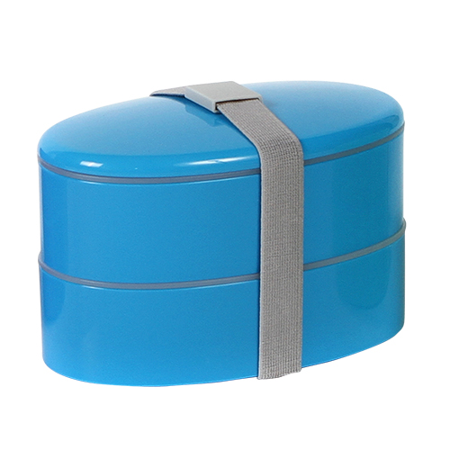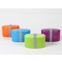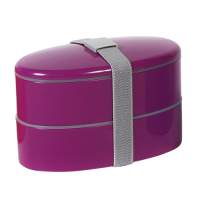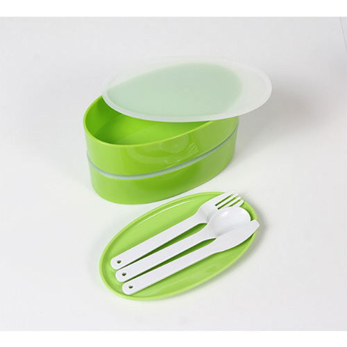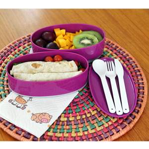 Contenedor de alimentos con 2 compartimentos, banda sujetadora de tapa y cubiertos (cuchara, tenedor y cuchillo), de plastico, colores: azul, naranja, morado y verde
