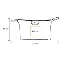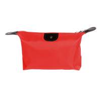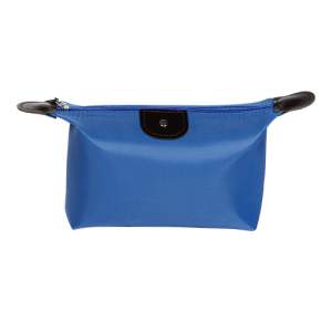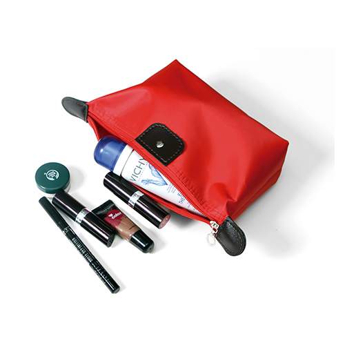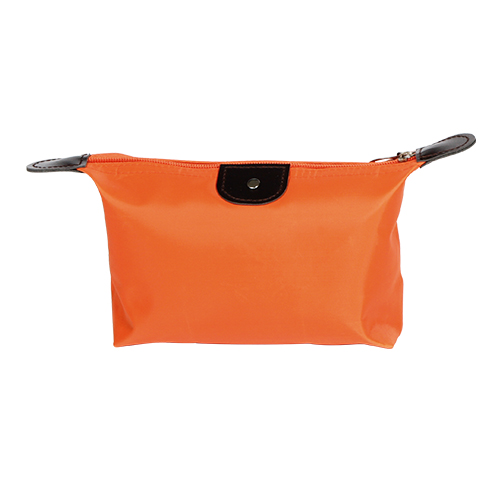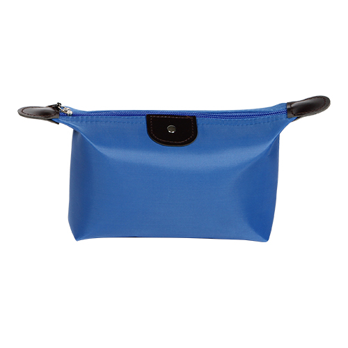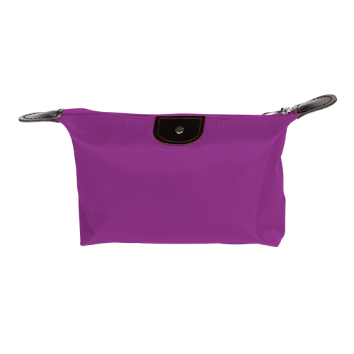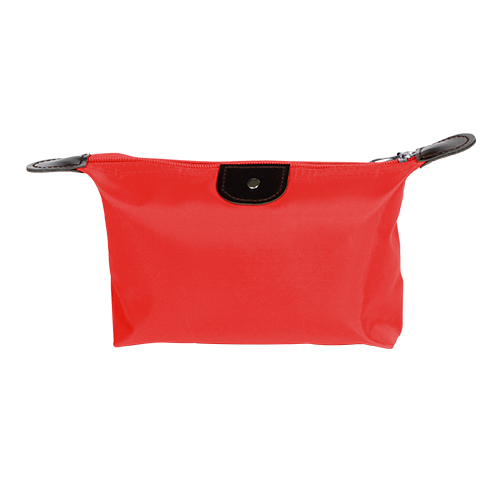 Cosmetiquera fabricada en poliester con detalles en curpiel, colores: azul, morado, naranja, rojo y rosa