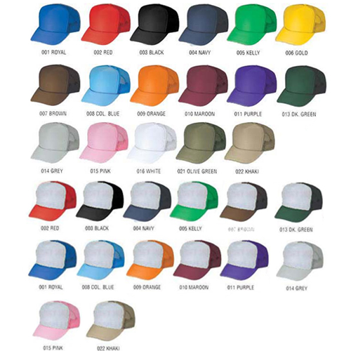 GORRA CON FRENTE ACOJINADO, 100% POLIESTER, MALLA DE ALGODON, 5 GAJOS, BOTON FORRADO, BROCHE DE PLASTICO.