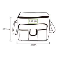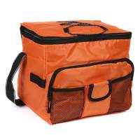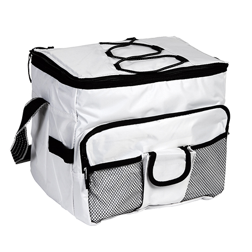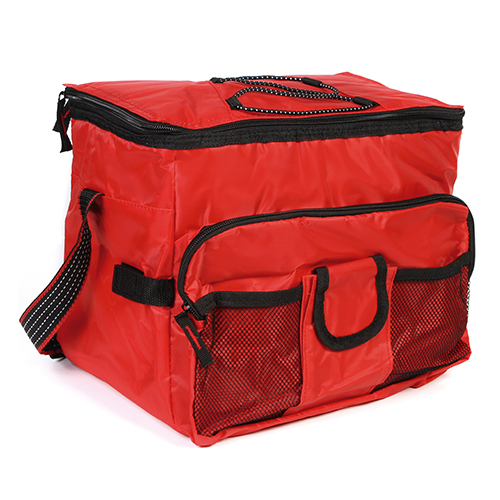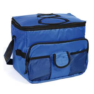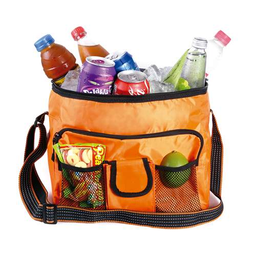 Hielera termica 16 pack fabricada en poliester con interior en polietileno, con asa y bolsa al frente, colores: azul, naranja, blanco y rojo