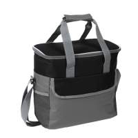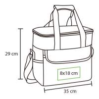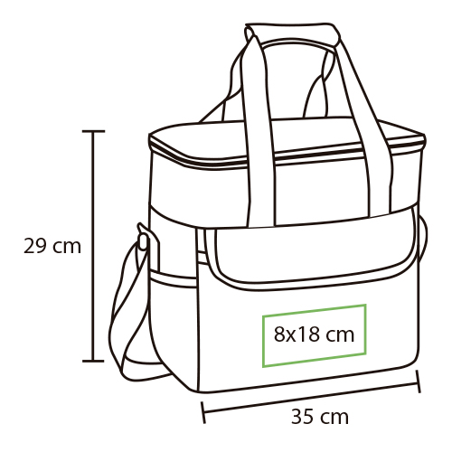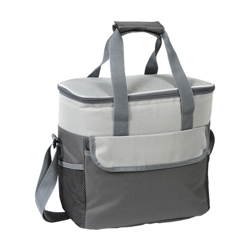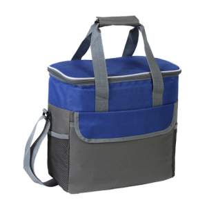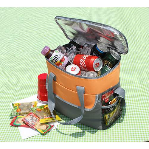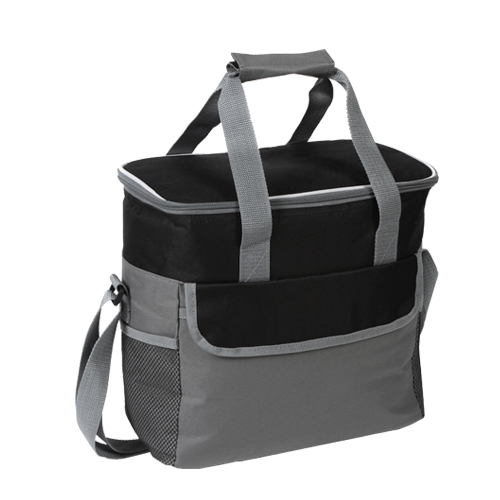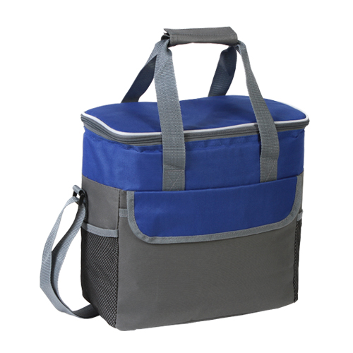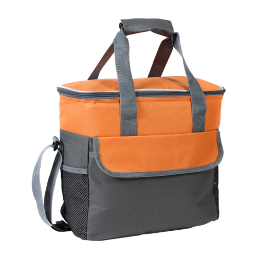 Hielera fabricada en poliester con forro pvc y aluminio, con bolsas tipo red en costados, colores: azul, gris, negro, naranja y rojo