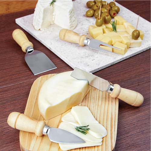 Juego de utensilios para cortar queso o carnes frías con mango y base de madera. Incluye: cuchillo, espátula, y tenedor