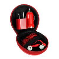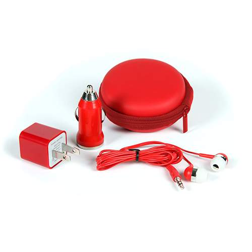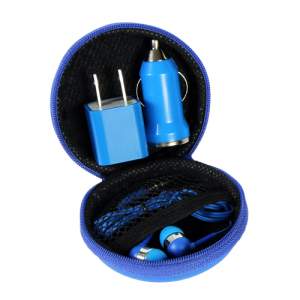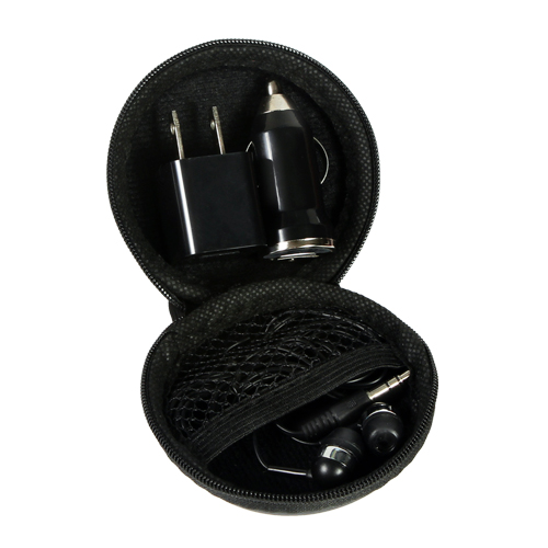 Kit de viaje con cargador para auto, cargador de pared y audifonos de conexion jack 3,5 mm (accesorios de plastico), estuche con cierre