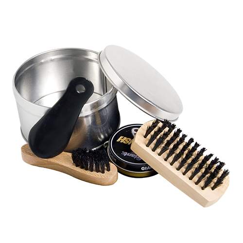 Set de lustrado con 4 piezas (cera color neutro, 2 cepillos y calzador) con estuche redondo metalico