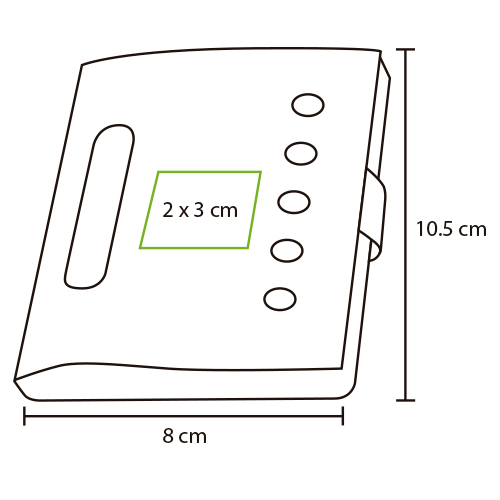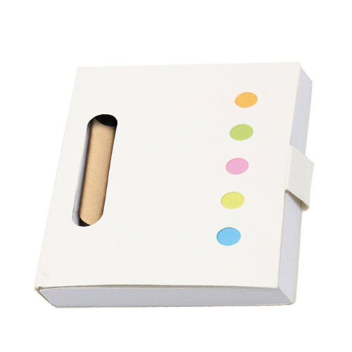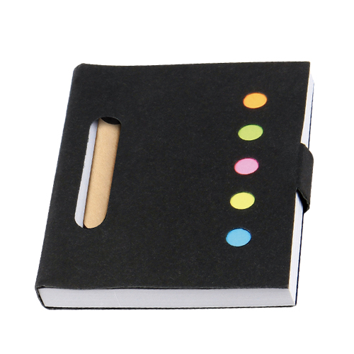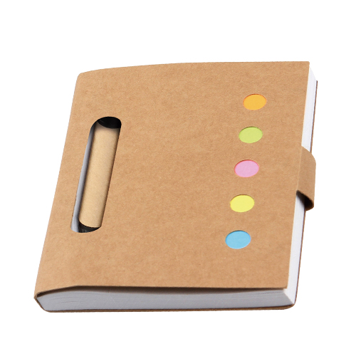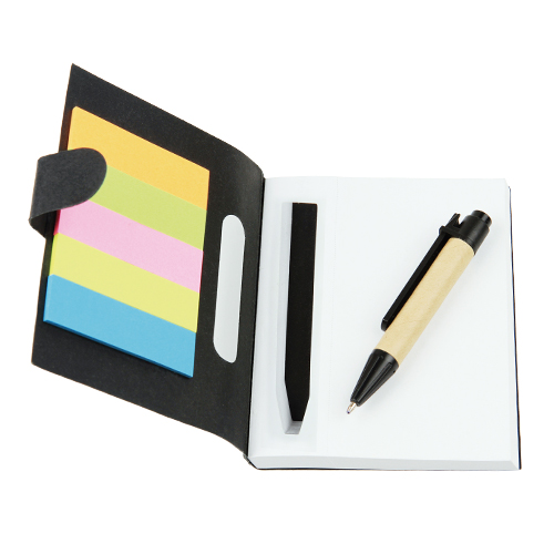 Mini libreta ecologica con 80 hojas blancas, banderitas de colores (125 en 5 colores) y pluma tinta negra, colores: blanco, negro y natural