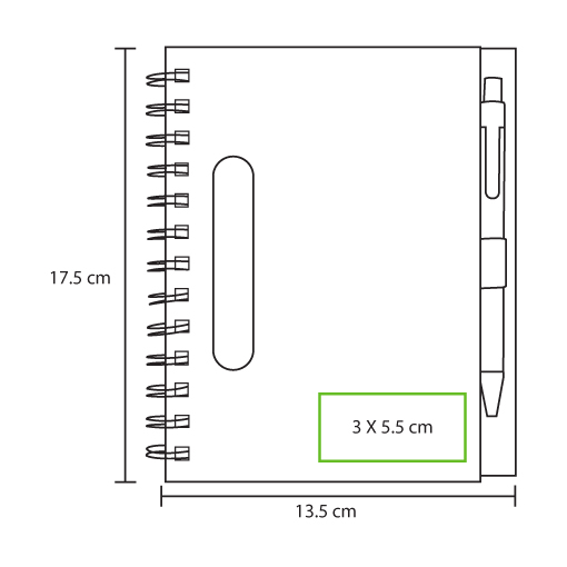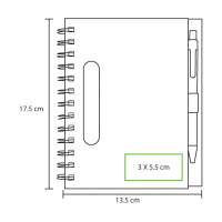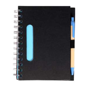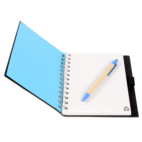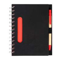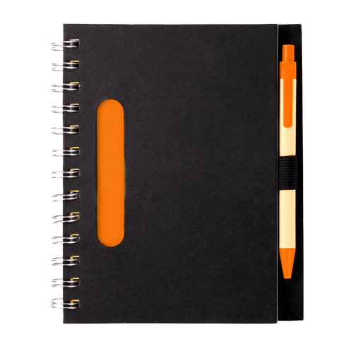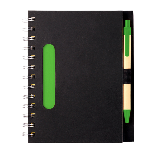 Libreta ecologica negra con 80 hojas de raya, pluma tinta negra y detalles en color: verde, naranja, rojo y azul