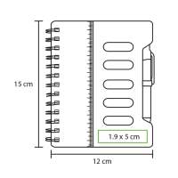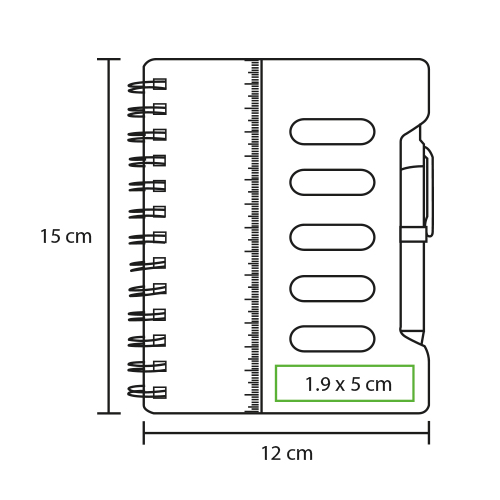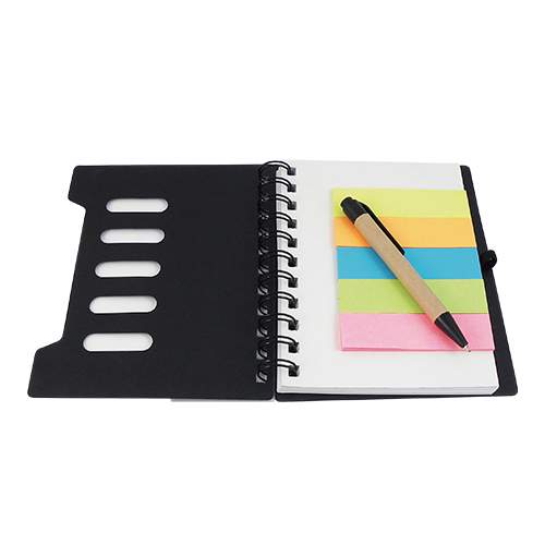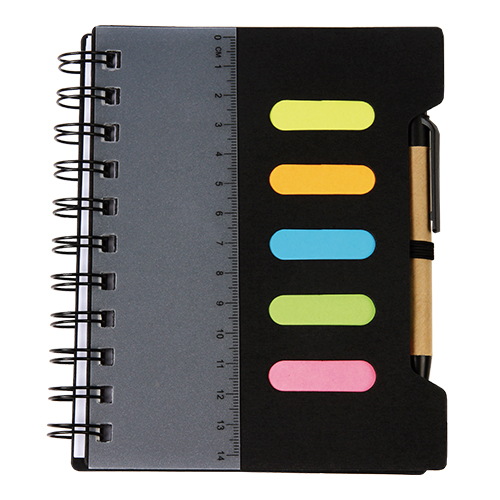 Libreta ecologica color negro con 70 hojas blancas, pluma tinta negra, banderitas de colores (125 en 5 colores) y regla de 14 cm