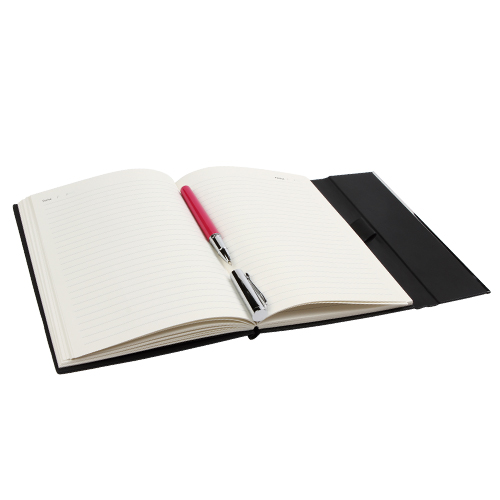 Libreta en color negro de curpiel, con 95 hojas de raya, apertura y cierre magnetico