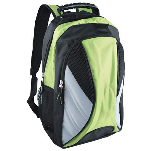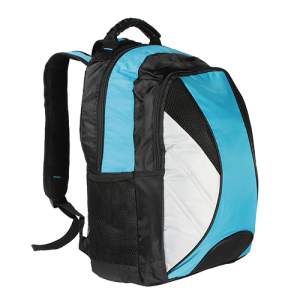 Mochila back pack fabricada en pvc con bolsa de red a un costado, colores: azul, negro y verde