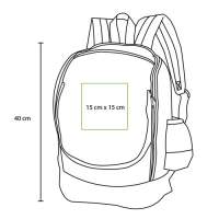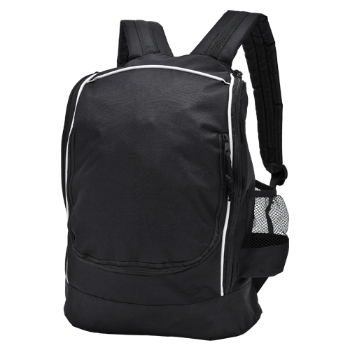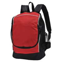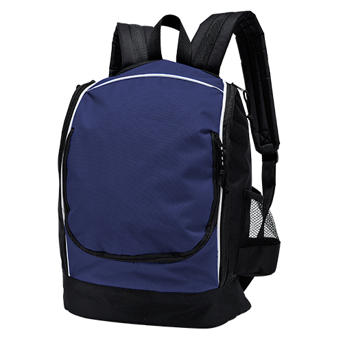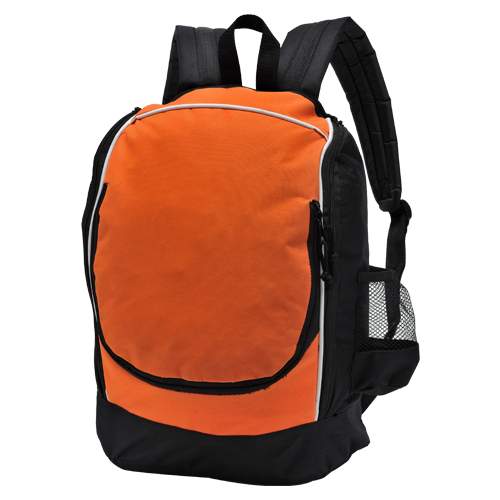 Mochila escolar tipo back pack con bolsa de red a un costado, fabricada en loneta, colores: azul, negro, naranja y rojo