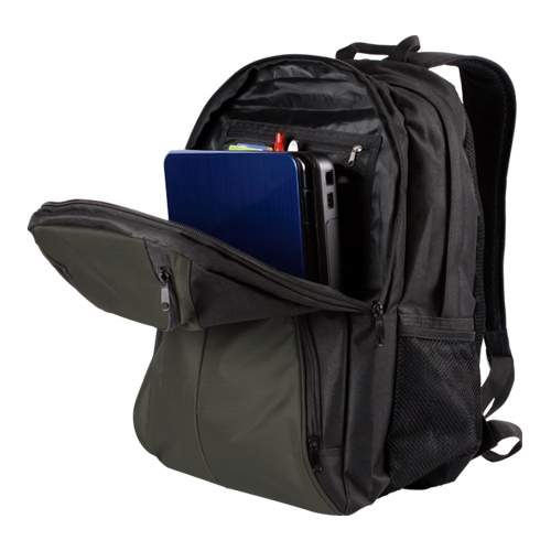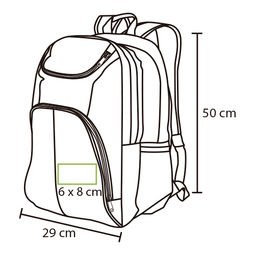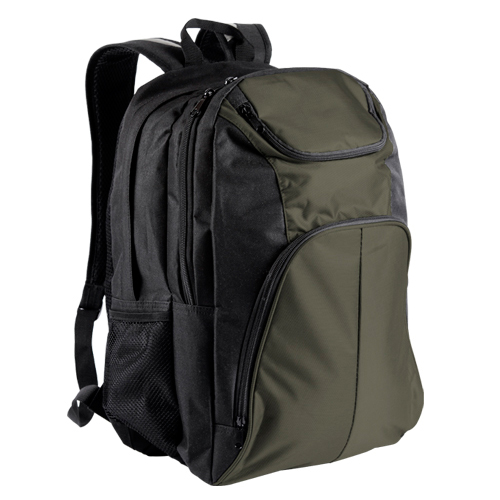 Mochila tipo bag pack con porta laptop fabricada en poliester, color negro con verde