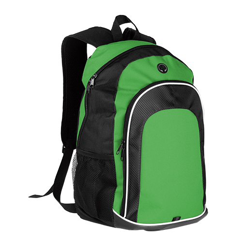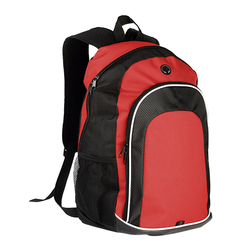 Mochila back pack fabricada en poliester con bolsa de red a un costado y salida de audifonos, colores: azul, naranja, verde y rojo