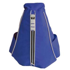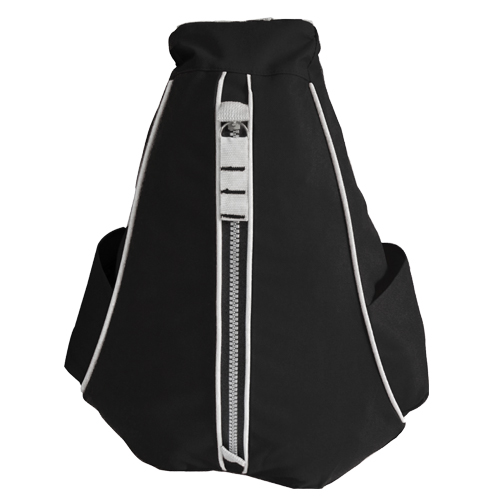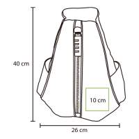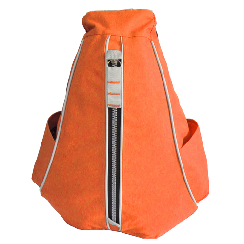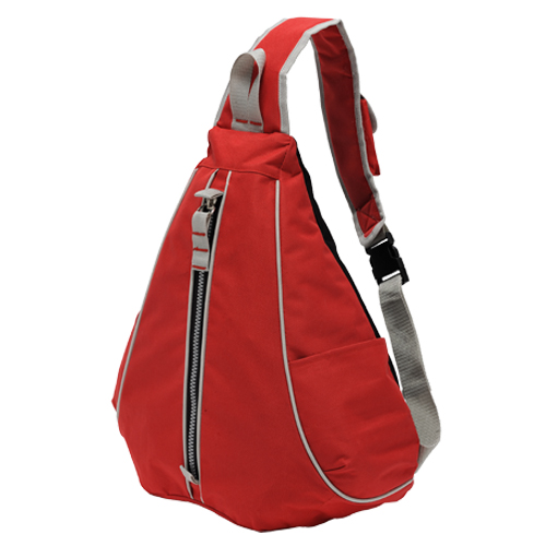Mochila triangular con cierre frontal, bolsas laterales y funda para accesorio en correa, fabricada en poliester