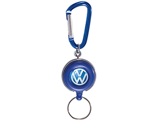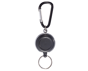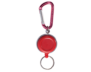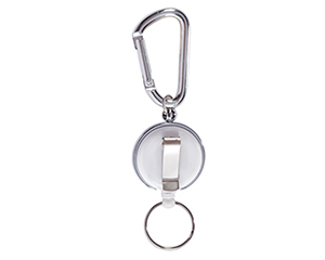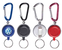Portagafete de plastico con cordon elastico y sistema retractil, con gancho de aluminio para sujetar a la ropa y arillo metalico para llaves. Diámetro 3.5cm.v