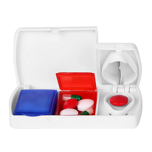 Pastillero fabricado en plastico color blanco con doble compartimento y cortador