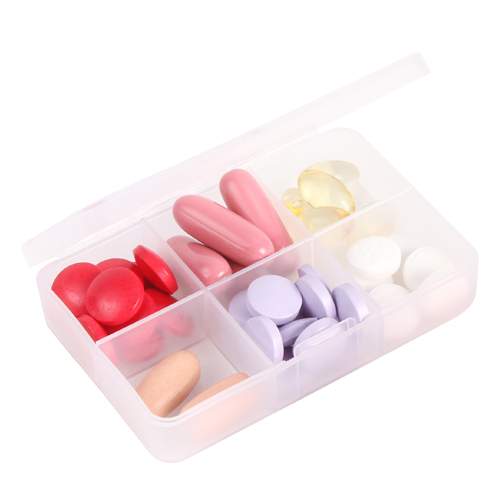 Pastillero fabricado en plastico con 6 compartimentos, colores: azul, blanco y rojo