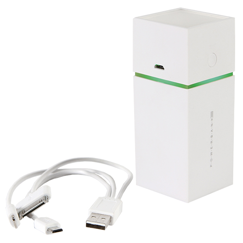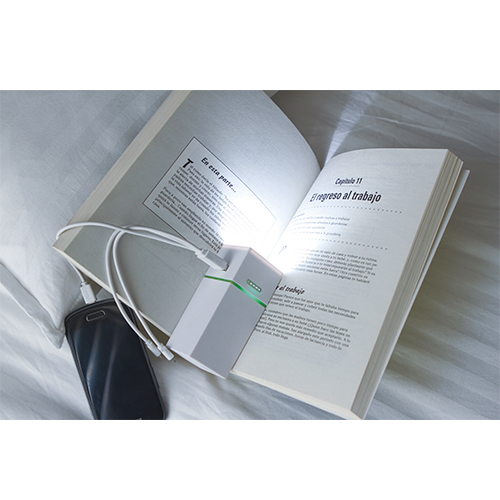 Power bank cubo de 10,000 mah, color blanco mate con detalle de luz y lampara, recargable con cable usb a pc y cable usb entrada de iphone y micro usb