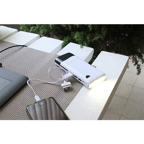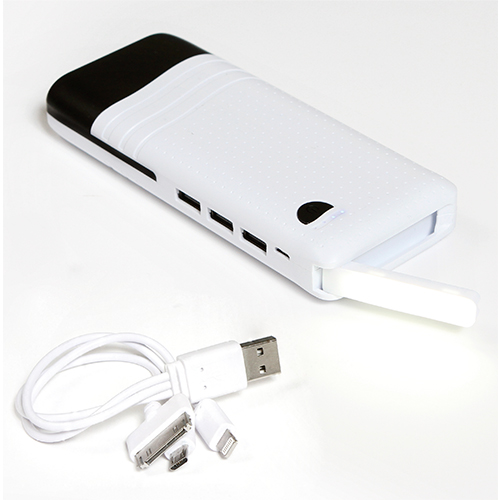 Power bank de plastico rectangular de 10,000 mah, lampara led, 3 puertos usb de carga, incluye cable usb con entrada de iphone y micro usb