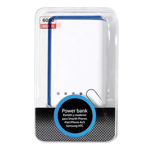 Power bank rectangular de 6000 mah con 2 salidas, recargable con cable usb a pc y cable usb entrada de iphone y micro usb