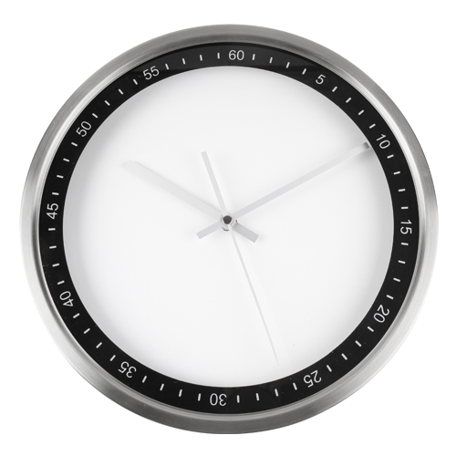 Reloj de pared con arillo de acero inoxidable y proteccion de cristal, incluye caja de carton individual y bateria