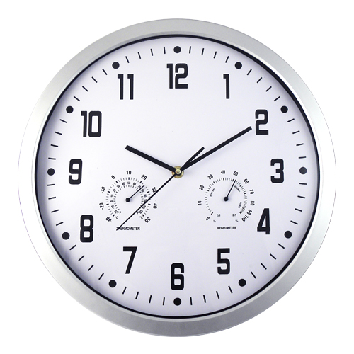 Reloj de pared con arillo de plastico y proteccion de cristal, termometro (mide temperatura) e hidrometro (mide humedad del aire), color plata, caja de carton