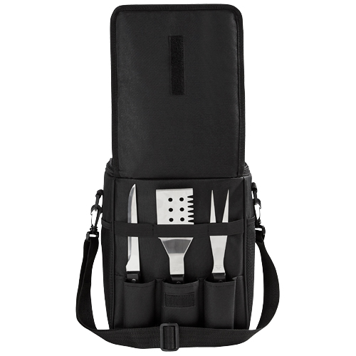 | Descripción: SET DE BBQ LERNA (Bolsa principal con función de hielera. Incluye bolsa frontal con 3 compartimentos internos para el set de cuchillo, espátula y tenedor para BBQ. Incluye asa para colgar en hombros y 2 bolsas laterales de red. ) | |