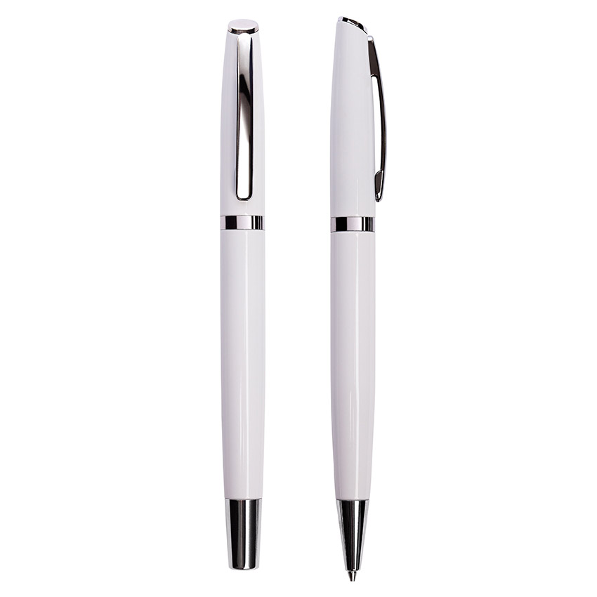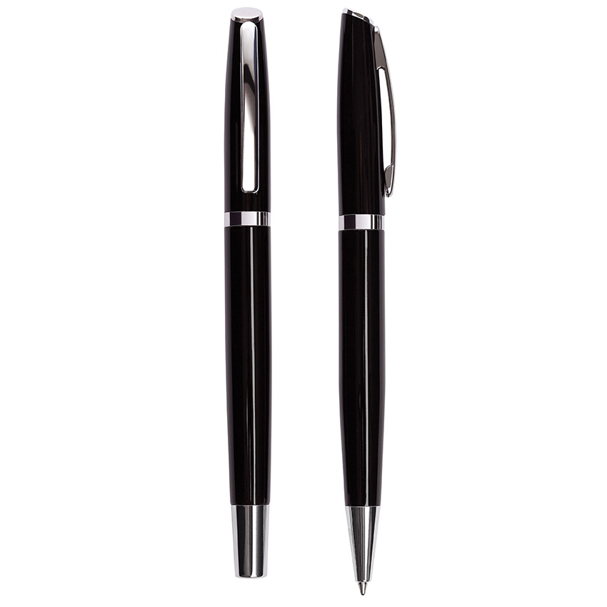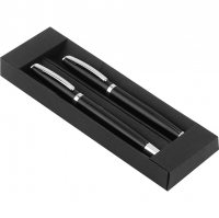 Boligrafo de aluminio. Contiene un Bolígrafo y un Roller Ball. Cuerpo de color esmaltado, clip, puntera y aro plateados. Incluye Estuche doble. Destape plateado al grabar con laser.