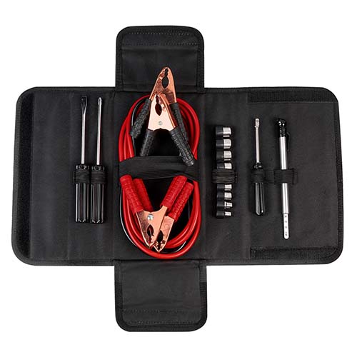 | Descripción: SET DE EMERGENCIA HUESCA (Contiene cables pasa corriente, 9 dados, medidor de presión de aire, desarmador punta de cruz, desarmador punta plana, desarmador para dados. Incluye estuche de tela.) | |
