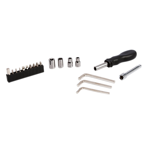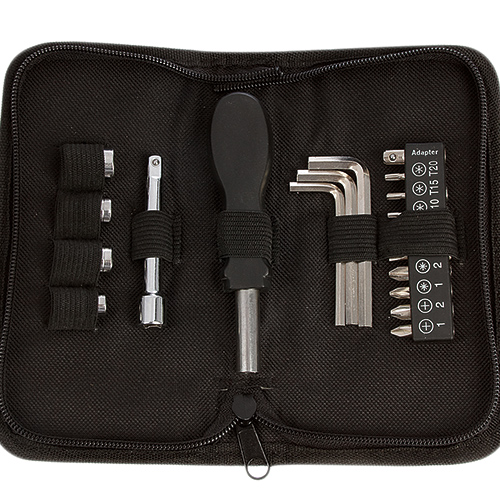 Descripción: SET DE HERRAMIENTAS INDUSTRY (Contiene mango y juego de puntas de desarmador, llaves allen, llaves para dados. Incluye estuche de tela.) |