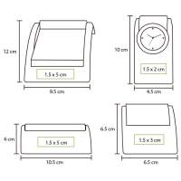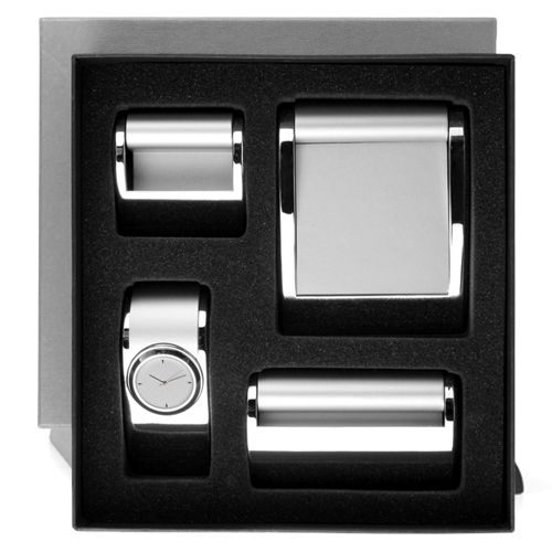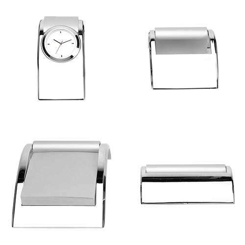 Juego de escritorio metalico con reloj, porta tarjetas, porta notas y porta celular, incluye caja de lujo
