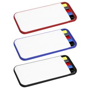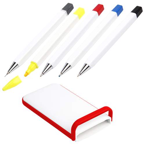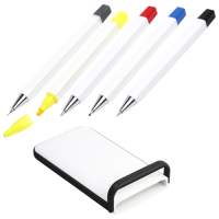 Set de escritura con 3 boligrafos tinta negra, azul y roja, lapiero y marcatextos, colores: azul, negro y rojo