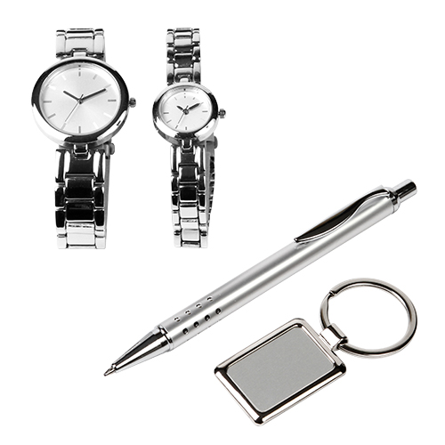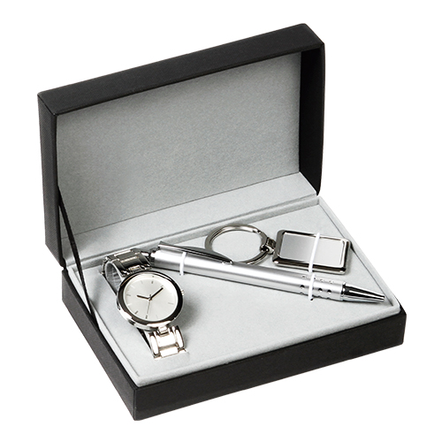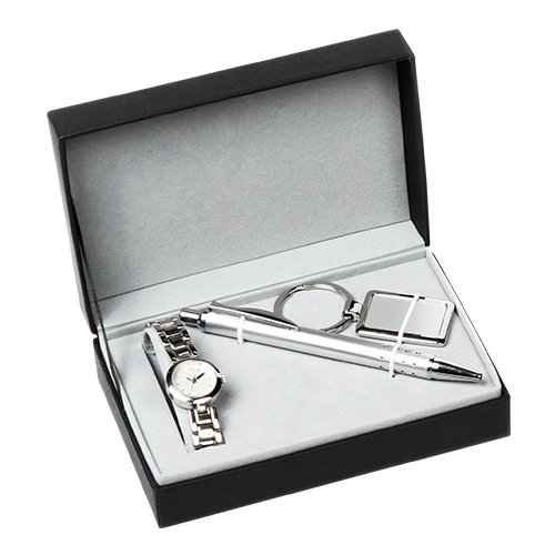 Set de juego con: reloj de pulso metalico, llavero y pluma metalica tinta negra, incluye caja de lujo
