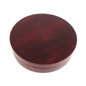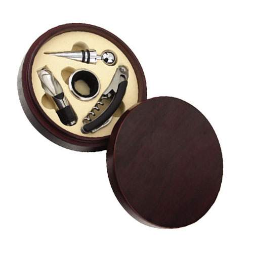 Set de abre vinos con 4 pzs (saca corchos, vertidor, tapon corta gota y aro antigoteo) en caja redonda de madera