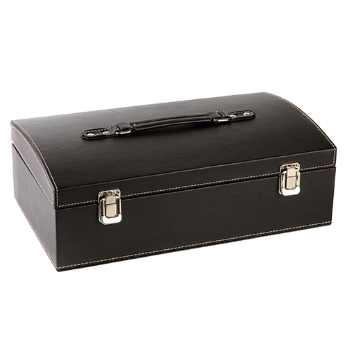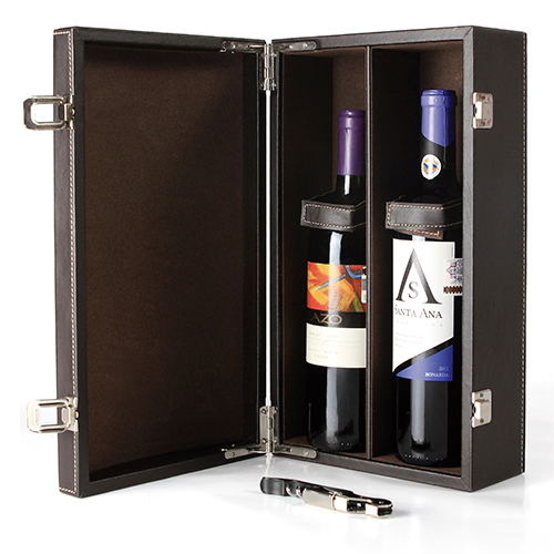 Set de vino con porta botellas doble, con broche y saca corchos, fabricado en mdf, carton, terciopelo y curpiel