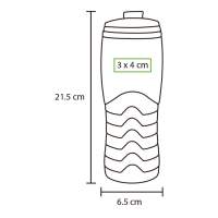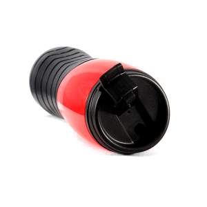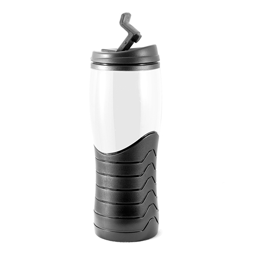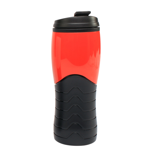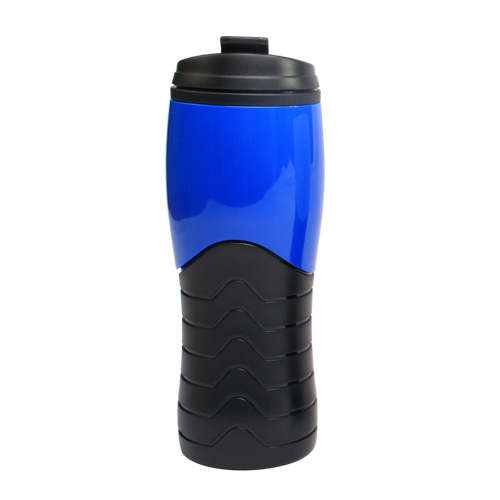 Termo de plastico con agarradera de hule, tapa anti-derrame y capacidad de 450 ml. colores: azul, blanco y rojo